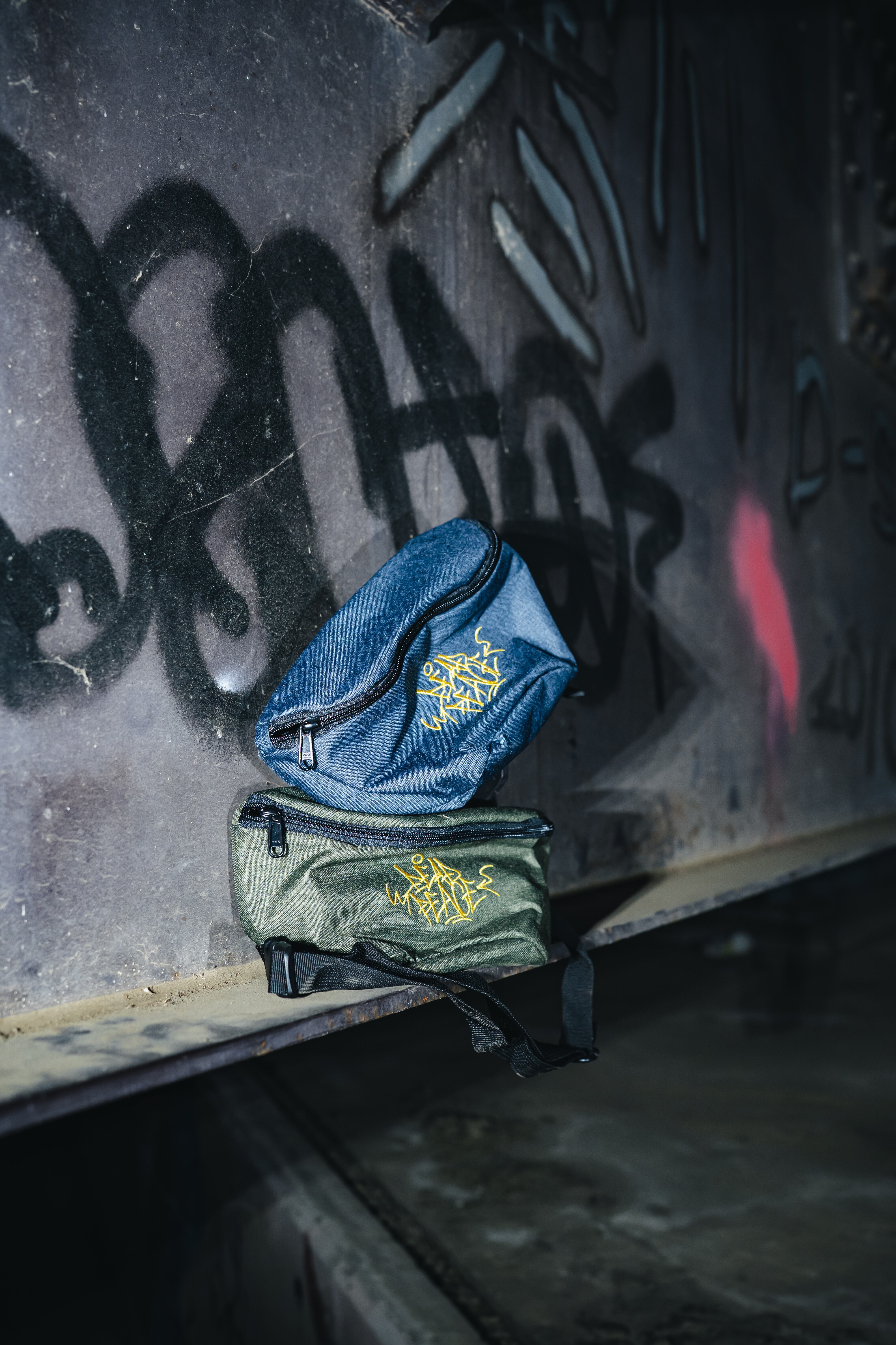 グラフィティロゴをゴールド刺繍で大胆に落とし込んだウエストバッグ。